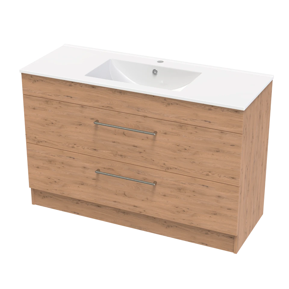 Make a statement with the Parker 1200mm Floor Vanity. With two spacious drawers, a hard wearing Vitreous China basin, and a modern design, it’s ideal for family bathrooms. Available in White, Black, or Oak cabinet finishes with your choice of three handle options. Made in New Zealand using FSC® certified NZ Radiata Pine and moisture resistant board.