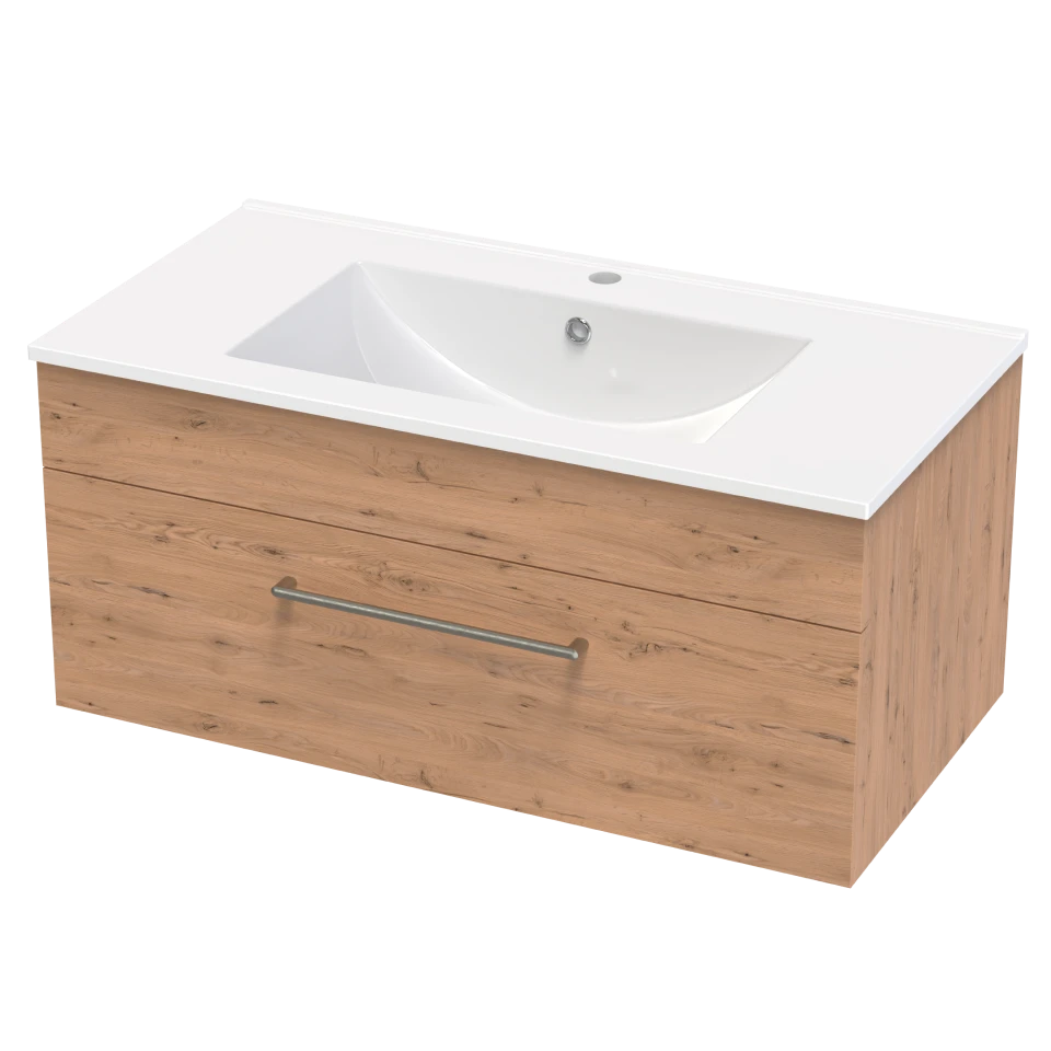 The Parker 900mm Single Drawer Wall Hung Vanity delivers a balance of style and function. It’s hard wearing Vitreous China top and floating design help create an open, modern feel. Choose from three handle finishes and cabinet colours in White, Black, or Oak. Made in New Zealand from FSC® certified NZ Radiata Pine and moisture resistant board.